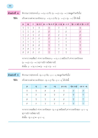 จากตารางจะเห็นว่า ค่าความจริงของ ~(p q) เหมือนกับค่าความจริงของ ~p ~q