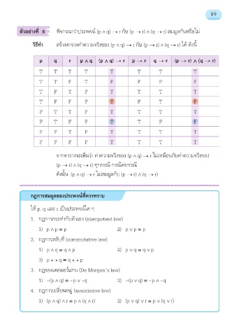 จากตารางจะเห็นว่า ค่าความจริงของ (p q) r ไม่เหมือนกับค่าความจริงของ