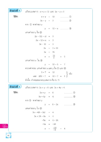 ตัวอย่างที่ 2 แก้ระบบสมการ x + y = 12 และ 2x - y = 3
