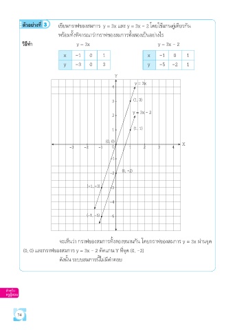 เขียนกราฟของสมการ y = 3x และ y = 3x - 2 โดยใช้แกนคู่เดียวกัน