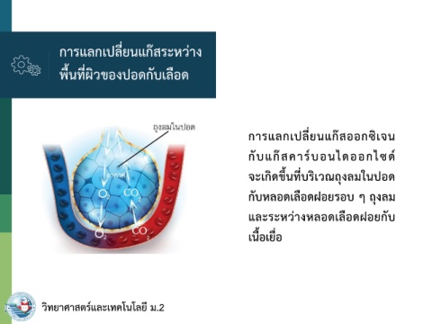 การแลกเปลี่ยนแก๊สระหว่าง พื้นที่ผิวของปอดกับเลือด การแลกเปลี่ยนแก๊สออกซิเจน กับแก๊สคาร์บอนไดออกไซด์ จะเกิดขึ้นที่บริเวณถุงลมในปอด กับหลอดเลือดฝอยรอบ ๆ ถุงลม และระหว่างหลอดเลือดฝอยกับ เนื้อเยื่อ วิทยาศาสตร์และเทคโนโลยี ม.2