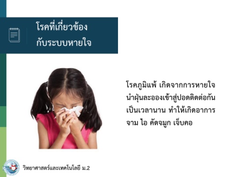 โรคที่เกี่ยวข้อง กับระบบหายใจ โรคภูมิแพ้ เกิดจากการหายใจ น าฝุ่นละอองเข้าสู่ปอดติดต่อกัน เป็นเวลานาน ท าให้เกิดอาการ จาม ไอ คัดจมูก เจ็บคอ วิทยาศาสตร์และเทคโนโลยี ม.2