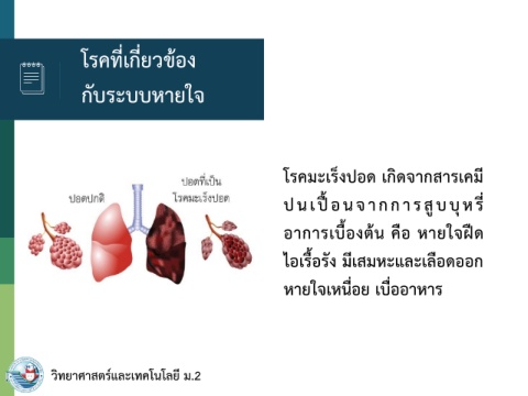 โรคที่เกี่ยวข้อง กับระบบหายใจ โรคมะเร็งปอด เกิดจากสารเคมี ปนเปื้อนจากการสูบบุหรี่ อาการเบื้องต้น คือ หายใจฝืด ไอเรื้อรัง มีเสมหะและเลือดออก หายใจเหนื่อย เบื่ออาหาร วิทยาศาสตร์และเทคโนโลยี ม.2