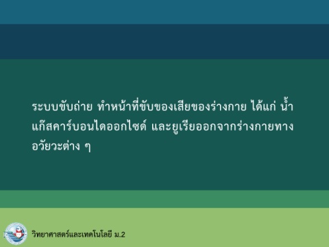 ระบบขับถ่าย ท าหน้าที่ขับของเสียของร่างกาย ได้แก่ น้ า แก๊สคาร์บอนไดออกไซด์ และยูเรียออกจากร่างกายทาง อวัยวะต่าง ๆ วิทยาศาสตร์และเทคโนโลยี ม.2