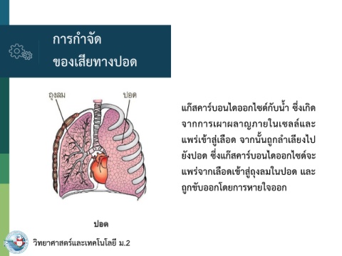 การก าจัด ของเสียทางปอด แก๊สคาร์บอนไดออกไซด์กับน้ า ซึ่งเกิด จากการเผาผลาญภายในเซลล์และ แพร่เข้าสู่เลือด จากนั้นถูกล าเลียงไป ยังปอด ซึ่งแก๊สคาร์บอนไดออกไซด์จะ แพร่จากเลือดเข้าสู่ถุงลมในปอด และ ถูกขับออกโดยการหายใจออก วิทยาศาสตร์และเทคโนโลยี ม.2
