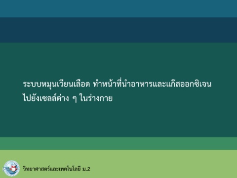 ระบบหมุนเวียนเลือด ท าหน้าที่น าอาหารและแก๊สออกซิเจน ไปยังเซลล์ต่าง ๆ ในร่างกาย วิทยาศาสตร์และเทคโนโลยี ม.2