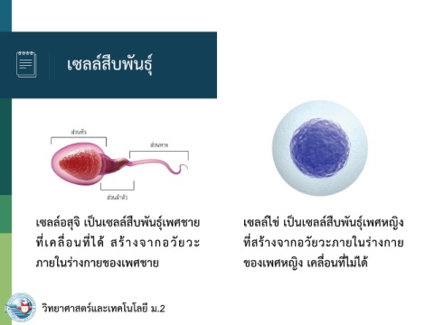 เซลล์สืบพันธุ์ เซลล์อสุจิ เป็นเซลล์สืบพันธุ์เพศชาย เซลล์ไข่ เป็นเซลล์สืบพันธุ์เพศหญิง ที่เคลื่อนที่ได้ สร้างจากอวัยวะ ที่สร้างจากอวัยวะภายในร่างกาย ภายในร่างกายของเพศชาย ของเพศหญิง เคลื่อนที่ไม่ได้ วิทยาศาสตร์และเทคโนโลยี ม.2