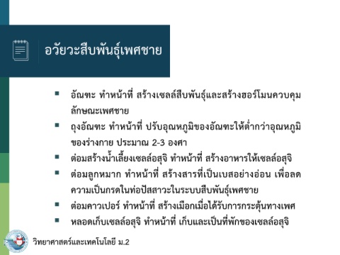 ▪ อัณฑะ ท าหน้าที่ สร้างเซลล์สืบพันธุ์และสร้างฮอร์โมนควบคุม