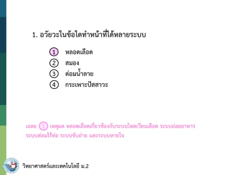 1. อวัยวะในข้อใดท าหน้าที่ได้หลายระบบ 1 หลอดเลือด 2 สมอง 3 ต่อมน้ าลาย 4 กระเพาะปัสสาวะ เฉลย 1 เหตุผล หลอดเลือดเกี่ยวข้องกับระบบไหลเวียนเลือด ระบบย่อยอาหาร ระบบต่อมไร้ท่อ ระบบขับถ่าย และระบบหายใจ วิทยาศาสตร์และเทคโนโลยี ม.2