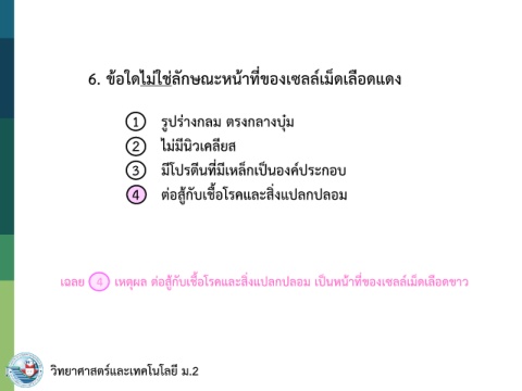 6. ข้อใดไม่ใช่ลักษณะหน้าที่ของเซลล์เม็ดเลือดแดง