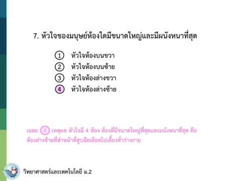 7. หัวใจของมนุษย์ห้องใดมีขนาดใหญ่และมีผนังหนาที่สุด