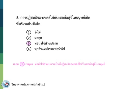 8. การปฏิสนธิของเซลล์ไข่กับเซลล์อสุจิในมนุษย์เกิด ที่บริเวณในข้อใด 1 รังไข่ 2 มดลูก 3 ท่อน าไข่ส่วนปลาย 4 ทุกต าแหน่งของท่อน าไข่ เฉลย 3 เหตุผล ท่อน าไข่ส่วนปลายเป็นที่ปฏิสนธิของเซลล์ไข่กับเซลล์อสุจิในมนุษย์ วิทยาศาสตร์และเทคโนโลยี ม.2