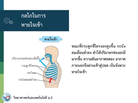 กลไกในการ หายใจเข้า ขณะที่กระดูกซี่โครงยกสูงขึ้น กะบัง ลมเลื่อนต่ าลง ท าให้ปริมาตรช่องอกมี มากขึ้น ความดันอากาศลดลง อากาศ ภายนอกจึงผ่านเข้าสู่ปอด เป็นจังหวะ หายใจเข้า วิทยาศาสตร์และเทคโนโลยี ม.2