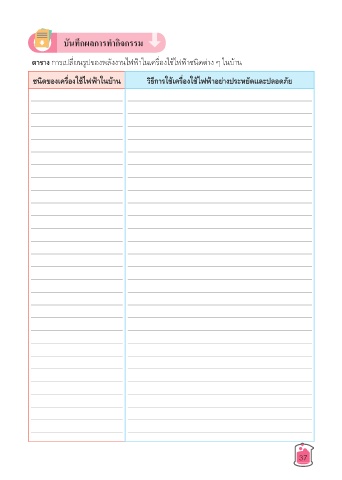 บันทึกผลการทำากิจกรรม ตาราง ก�รเปลี่ยนรูปของพลังง�นไฟฟ้�ในเครื่องใช้ไฟฟ้�ชนิดต่�ง ๆ ในบ้�น ชนิดของเครื่องใช้ไฟฟ้าในบ้าน วิธีการใช้เครื่องใช้ไฟฟ้าอย่างประหยัดและปลอดภัย 37
