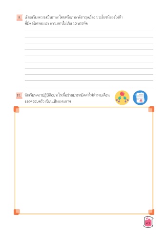 9. เขียนเรียงคว�มเป็นภ�ษ�ไทยหรือภ�ษ�อังกฤษเรื่อง ประโยชน์ของไฟฟ้� ที่มีต่อโลกของเร� คว�มย�วไม่เกิน 10 บรรทัด 10. นักเรียนควรปฏิบัติอย่�งไรเพื่อช่วยประหยัดค่�ไฟฟ้�ร�ยเดือน ของครอบครัว เขียนเป็นแผนภ�พ 43