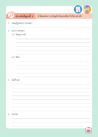 ประเด็นปัญหาที่ 1 นํ้ามีผลต่อการเจริญเติบโตของพืชหรือไม่ อย่างไร 1. สมมุติฐานของการทดลอง 2. แบบการทดลอง 2.1 วัสดุอุปกรณ์ 2.2 วิธีทํา 3. บันทึกผล 4. สรุปผล 23