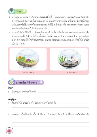 2 ตัว ปิดฝาขวดต้งไว้ในท่ท่มีแสงส่องถึง สังเกตส่งมีชีวิตและลักษณะของสิ่งแวดล้อมในโถแก้วใส