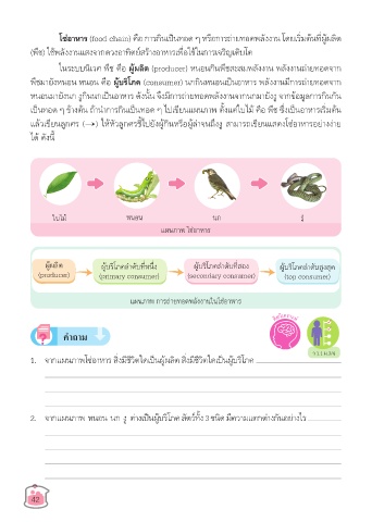 แล้วเขียนลูกศร ( ) ให้หัวลูกศรชี้ไปยังผู้กินหรือผู้ล่าจนถึงงู สามารถเขียนแสดงโซ่อาหารอย่างง่าย