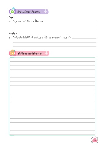 ? คำ�ถ�มก่อนทำ�กิจกรรม ปัญห� 1. ปัญหาของการทำากิจกรรมนี้คืออะไร สมมุติฐ�น 2. นักเรียนคิดว่าสิ่งมีชีวิตในสายใยอาหารมีการถ่ายทอดพลังงานอย่างไร บันทึกผลก�รทำ�กิจกรรม 53