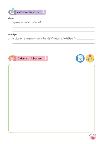? คำ�ถ�มก่อนทำ�กิจกรรม ปัญห� 1. ปัญหาของการทำากิจกรรมนี้คืออะไร สมมุติฐ�น 2. นักเรียนคิดว่าสารพิษที่เกิดการสะสมในสิ่งมีชีวิตในโซ่อาหารเกิดขึ้นได้อย่างไร บันทึกผลก�รทำ�กิจกรรม 65