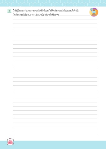 2. ถ้ามีผู้อื่นถามว่าแสงจากหลอดไฟฟ้าช่วยทำาให้พืชสังเคราะห์ด้วยแสงได้หรือไม่ นักเรียนจะมีวิธีตอบคำาถามนี้อย่างไร อธิบายให้ชัดเจน 72