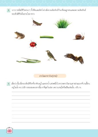 8. จากภาพสิ่งมีชีวิตต่าง ๆ ทั้งพืชและสัตว์ ต่างมีความสัมพันธ์กัน เขียนลูกศรแสดงความสัมพันธ์