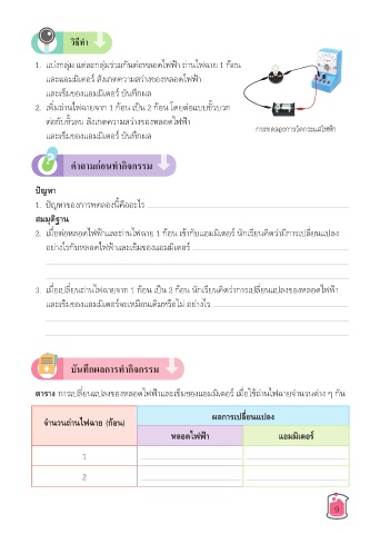 2. เมื่อต่อหลอดไฟฟ้�และถ่�นไฟฉ�ย 1 ก้อน เข้�กับแอมมิเตอร์ นักเรียนคิดว่�มีก�รเปลี่ยนแปลง