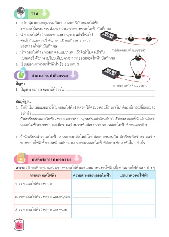 3. ถ้�นักเรียนนำ�หลอดไฟฟ้� 2 หลอดม�ต่อแบบอนุกรมกัน แล้วจึงนำ�ไปต่อเข้�กับแบตเตอรี่ นักเรียนคิดว่�