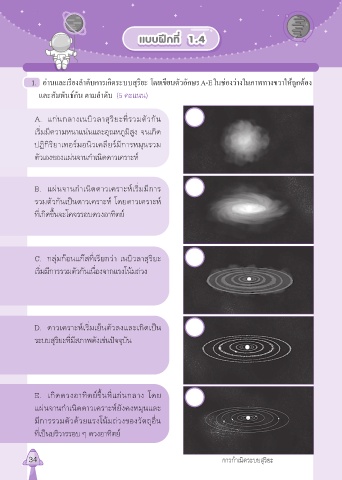 1. อ่านและเรียงลำาดับการเกิดระบบสุริยะ โดยเขียนตัวอักษร A-E ในช่องว่างในภาพทางขวาให้ถูกต้อง