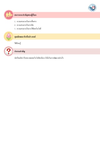 ี ้ สมรรถนะสาคัญของผูเรยน ื่ 1. ความสามารถในการสอสาร ิ 2. ความสามารถในการคด 3. ความสามารถในการใช้เทคโนโลยี คุณลักษณะอันพึงประสงค์ ่ ี ใฝเรยนร ู ้ ค าถามสาคัญ นักเรยนคดว่าในอนาคตเทคโนโลยีจะมแนวโน้มในการพัฒนาอย่างไร ิ ี ี