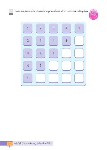 2. นักเรียนคิดวิเคราะห์เกี่ยวกับการคิดหารูปแบบ โดยเติมตัวเลขลงในช่องว่างให้ถูกต้อง 1 2 3 4 1 2 3 4 1 3 4 1 4 1 1 22 เทคโนโลยี (วิทยาการคำานวณ) ชั้นมัธยมศึกษาปีที่ 2