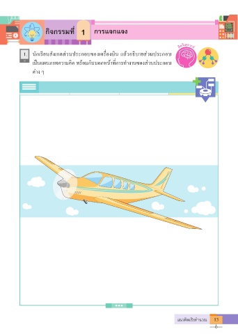 กิจกรรมที่ 1 การแจกแจง 1. นักเรียนสังเกตส่วนประกอบของเครื่องบิน แล้วอธิบายส่วนประกอบ เป็นแผนภาพความคิด พร้อมกับบอกหน้าที่การทำางานของส่วนประกอบ ต่าง ๆ แนวคิดเชิงคำ�นวณ 13