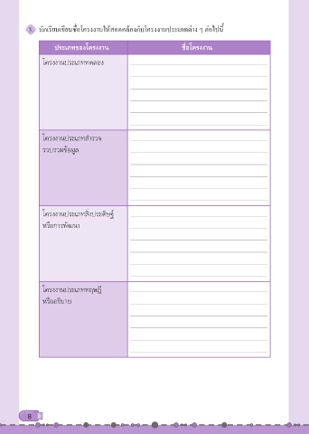 3. นักเรียนเขียนชื่อโครงงานให้สอดคล้องกับโครงงานประเภทต่าง ๆ ต่อไปนี้ ประเภทของโครงงาน ชื่อโครงงาน โครงงานประเภททดลอง โครงงานประเภทสำารวจ รวบรวมข้อมูล โครงงานประเภทสิ่งประดิษฐ์ หรือการพัฒนา โครงงานประเภททฤษฎี หรืออธิบาย 8