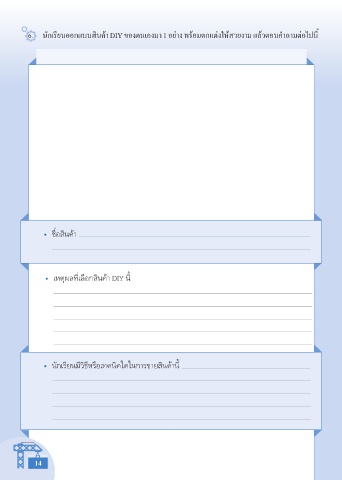 6. นักเรียนออกแบบสินค้า DIY ของตนเองมา 1 อย่าง พร้อมตกแต่งให้สวยงาม แล้วตอบคำาถามต่อไปนี้ • ชื่อสินค้า • เหตุผลที่เลือกสินค้า DIY นี้ • นักเรียนมีวิธีหรือเทคนิคใดในการขายสินค้านี้ 14
