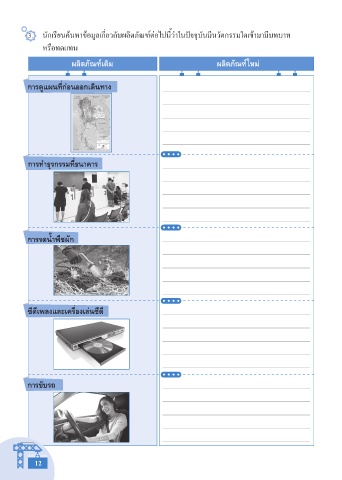 3. นักเรียนค้นหาข้อมูลเกี่ยวกับผลิตภัณฑ์ต่อไปนี้ว่าในปัจจุบันมีนวัตกรรมใดเข้ามามีบทบาท หรือทดแทน ผลิตภัณฑ์เดิม ผลิตภัณฑ์ใหม่ การดูแผนที่ก่อนออกเดินทาง การทำาธุรกรรมที่ธนาคาร การรดนำ้าพืชผัก ซีดีเพลงและเครื่องเล่นซีดี การขับรถ 12