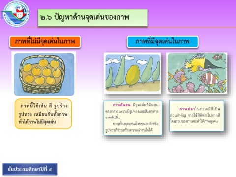 ๒.๖ ปัญหาด้านจุดเด่นของภาพ ภาพที่ไม่มีจุดเด่นในภาพ ภาพที่มีจุดเด่นในภาพ ภาพนี้ใช้เส้น สี รูปร่าง รูปทรง เหมือนกันทั้งภาพ ท าให้ภาพไม่มีจุดเด่น