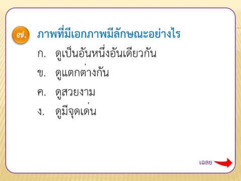 ๗. ภาพที่มีเอกภาพมีลักษณะอย่างไร ก. ดูเป็นอันหนึ่งอันเดียวกัน ข. ดูแตกต่างกัน ค. ดูสวยงาม ง. ดูมีจุดเด่น เฉลย