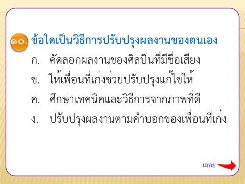 ๑๐. ข้อใดเป็นวิธีการปรับปรุงผลงานของตนเอง ก. คัดลอกผลงานของศิลปินที่มีชื่อเสียง ข. ให้เพื่อนที่เก่งช่วยปรับปรุงแก้ไขให้ ค. ศึกษาเทคนิคและวิธีการจากภาพที่ดี ง. ปรับปรุงผลงานตามคำบอกของเพื่อนที่เก่ง เฉลย