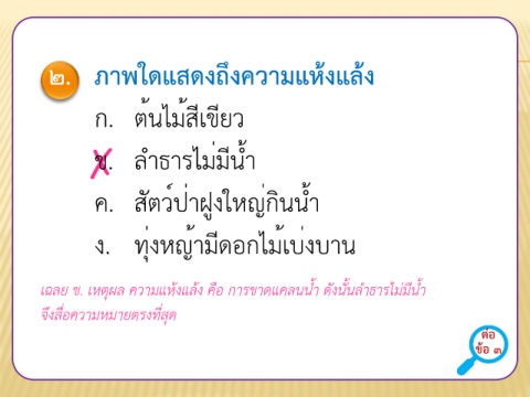 ๒. ภาพใดแสดงถึงความแห้งแล้ง ก. ต้นไม้สีเขียว ✗ ข. ลำธารไม่มีน้ำ ค. สัตว์ป่าฝูงใหญ่กินน้ำ ง. ทุ่งหญ้ามีดอกไม้เบ่งบาน เฉลย ข. เหตุผล ความแห้งแล้ง คือ การขาดแคลนน้้า ดังนั้นล้าธารไม่มีน้้า จึงสื่อความหมายตรงที่สุด ต่อ ข้อ ๓