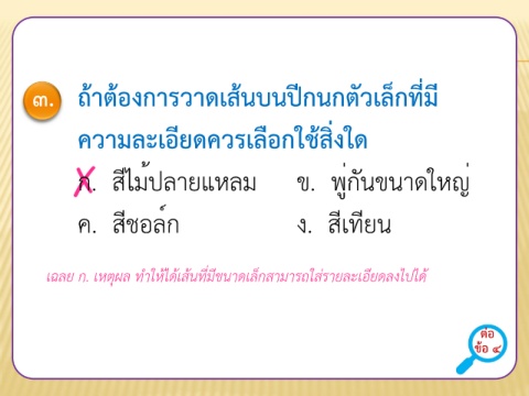 ๓. ถ้าต้องการวาดเส้นบนปีกนกตัวเล็กที่มี ความละเอียดควรเลือกใช้สิ่งใด ✗ ข. พู่กันขนาดใหญ่ ก. สีไม้ปลายแหลม ค. สีชอล์ก ง. สีเทียน เฉลย ก. เหตุผล ท้าให้ได้เส้นที่มีขนาดเล็กสามารถใส่รายละเอียดลงไปได้ ต่อ ข้อ ๔