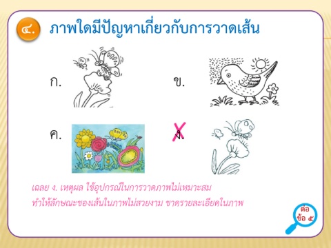 ๔. ภาพใดมีปัญหาเกี่ยวกับการวาดเส้น ก. ข. ค. ✗ ง. เฉลย ง. เหตุผล ใช้อุปกรณ์ในการวาดภาพไม่เหมาะสม ท้าให้ลักษณะของเส้นในภาพไม่สวยงาม ขาดรายละเอียดในภาพ ต่อ ข้อ ๕