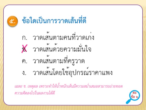 ๕. ข้อใดเป็นการวาดเส้นที่ดี ก. วาดเส้นตามคนที่วาดเก่ง ✗ ข. วาดเส้นด้วยความมั่นใจ ค. วาดเส้นตามที่ครูวาด ง. วาดเส้นโดยใช้อุปกรณ์ราคาแพง เฉลย ข. เหตุผล เพราะท้าให้น้้าหนักเส้นมีความสม่้าเสมอสามารถถ่ายทอด ความคิดลงไปในผลงานได้ดี ต่อ ข้อ ๖