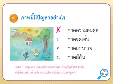 ๘. ภาพนี้มีปัญหาอย่างไร ✗ ก. ขาดความสมดุล ข. ขาดจุดเด่น ค. ขาดเอกภาพ ง. ขาดสีสัน เฉลย ก. เหตุผล รายละเอียดของภาพส่วนใหญ่อยู่ด้านขวามือ ต่อ ท้าให้ภาพด้านซ้ายมือว่างเกินไป ท้าให้ภาพไม่สมดุลกัน ข้อ ๙