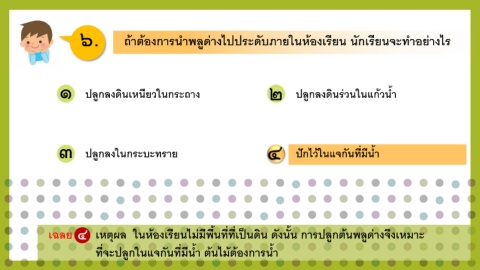 เฉลย เหตผล ในห้องเรยนไมมีพื้นที่ที่เปนดิน ดงน้น การปลูกตนพลูดางจาึงเหมาะ