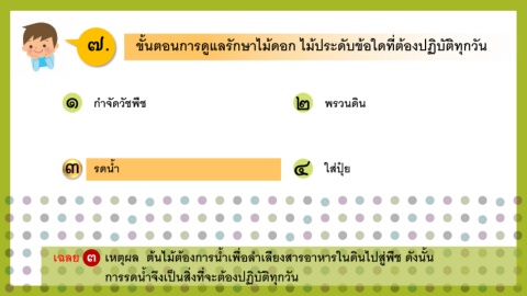๗. ข้นตอนการดูแลรกษาไมดอก ไมประดับขอใดที่ต้องปฏิบัติทุกวัน ้ ั ั ้ ้ ก าจาัดวัชพืช พรวนดิน น้ ุ ร รดน ้าา ใสปย ๋ ด ่ เฉลย เหตผล ต้นไมต้องการน ้าเพื่อล าเลยงสารอาหารในดินไปสูพืช ดงน้น ี ุ ั ั ่ ้ ็ การรดน ้าจาึงเปนส่งที่จาะตองปฏิบัติทุกวน ิ ั ้