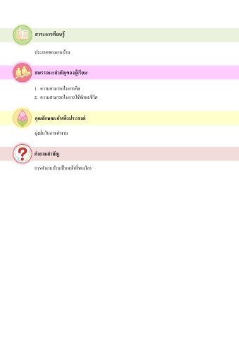สาระการเรยนรู ้ ี ประเภทของงานบ้าน ้ ี สมรรถนะสาคัญของผูเรยน ิ 1. ความสามารถในการคด ี 2. ความสามารถในการใช้ทักษะชวิต คุณลักษณะอันพึงประสงค ์ ม่งมั่นในการท างาน ุ ค าถามสาคัญ การท างานบ้านเปนหน้าทของใคร ี่ ็