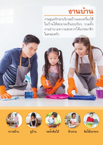 งานบ้าน งานดูแลรักษาบริเวณบ้านและเคร่องใช้ ื ั ในบ้านให้สะอาดเป็นระเบียบ รวมท้ง ำ งานอานวยความสะดวกให้แก่สมาชิก ในครอบครัว กวาดบ้าน ถูบ้าน รดน้าต้นไม้ ล้างจาน จัดโต๊ะอาหาร ำ