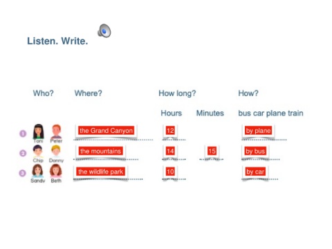 Listen. Write. the Grand Canyon 12 by plane the mountains 14 15 by bus the wildlife park 10 by car