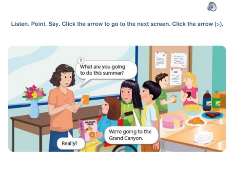 Listen. Point. Say. Click the arrow to go to the next screen. Click the arrow (>).
