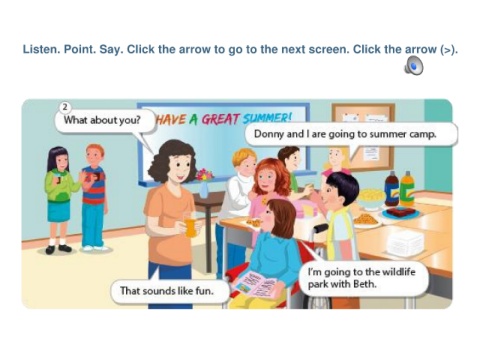 Listen. Point. Say. Click the arrow to go to the next screen. Click the arrow (>).